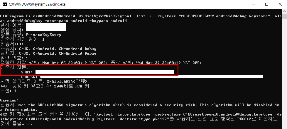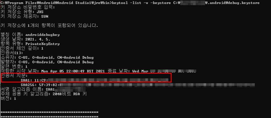 | C:\Program Files\Android\Android Studio1\jre\bin>keytool -list -v -keystore C:\개인PC 경로별로 상이함\.android\debug.keystore -alias androiddebugkey |